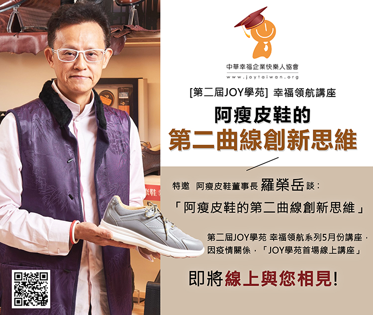 但近年來全球零售業面對重大衝擊,加上今年新冠疫情的洗禮,在在構成嚴峻考驗,身為台灣鞋業龍頭的阿瘦實業有何應對之道呢?「JOY學苑夢幻學校 幸福領航系列」特地邀請阿瘦實業現任董事長羅榮岳,以〈「阿瘦」第二成長曲線之傳承與轉型〉為題,剖析阿瘦如何因應變局下的威脅,轉危機為商機。